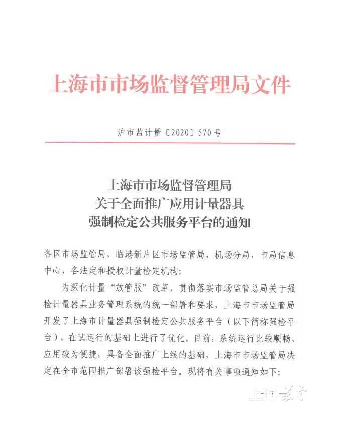 上海市市场监督管理局关于全面推广应用计量器具强制检定公共服务平台的通知