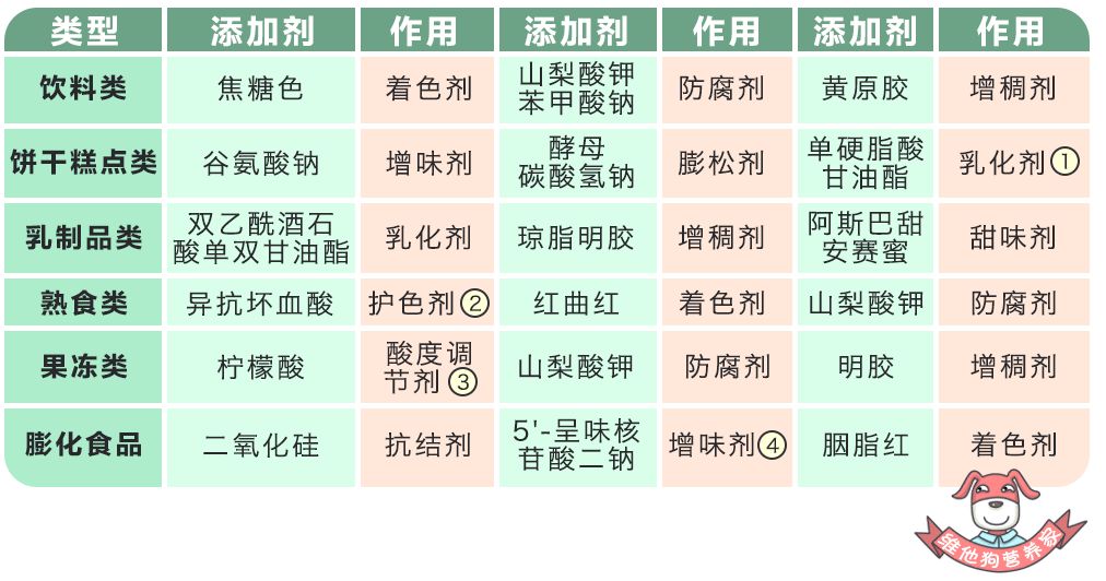 同时,为了进一步减少大家的恐慌,狗狗也整理了一张常见的添加剂一览表,大家可以对照一下。