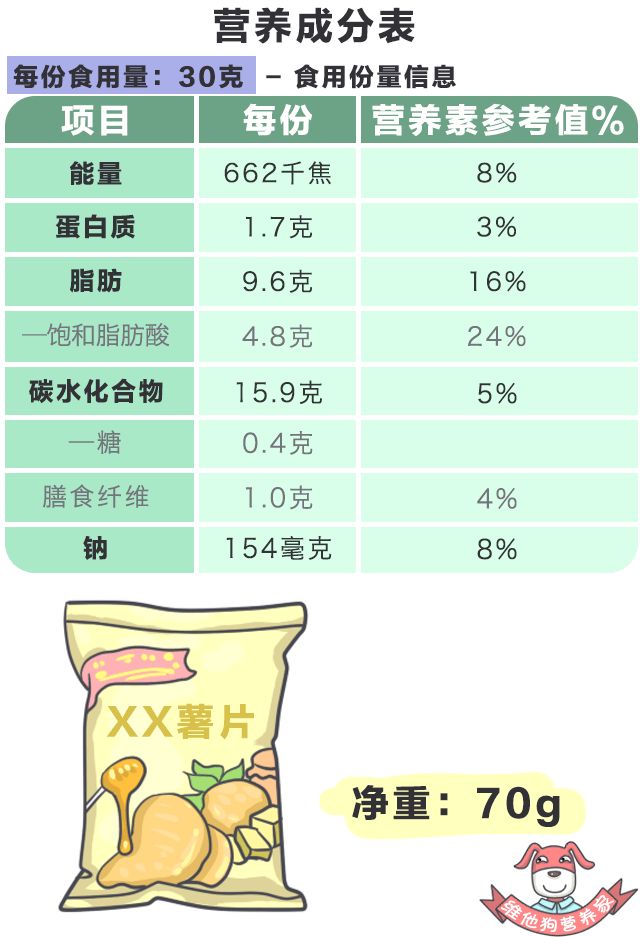 说人话就是:比如上面的薯片,脂肪NRV%是16%,假如我们吃了30g的份量,那么就等于我们吃下了全天所需脂肪量的16%,
